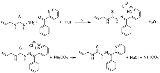 Nonetheless, continuous heating for up to 8 h was necessary to perform this reaction. Therefore, another two-step method was also used for the synthesis of this thiosemicarbazone as an analog of the method described in [15] (Scheme 2). In this method, equimolar amounts of 4-allylthiosemicarbazide, 2-benzoylpyridine, and a concentrated aqueous solution of hydrochloric acid were placed in the flask. The reaction was finalized within 40 min. As a result, the hydrochloric salt of the corresponding thiosemicarbazone ([H2L] Cl) was precipitated. It was separated by filtration and then treated with cold ethanol in small amounts. After that, the obtained salt was treated with an aqueous solution of sodium carbonate, forming the desired thiosemicarbazone. This method is a huge improvement in terms of time.