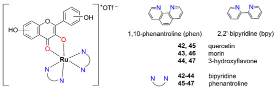 Starting from cis-[RuII(bpy)2Cl2] or [RuII(phen)2(CO3)], Zahirović et al. synthesized a series of octahedral cationic ruthenium (II) complexes 42–47 with OH–F ligands [50]. In these complexes, the diimine ligands, 2,2′-bipyridine (bpy) or 1,10-phenanthroline (phen), are coordinated in a bidentate manner through nitrogen atoms, while the OH–F ligand is coordinated via two oxygen atoms in a maltol-type binding mode (Figure 10). The resulting complexes are low-spin, diamagnetic species consistent with a t2g6 electronic configuration of the Ru(II) center.