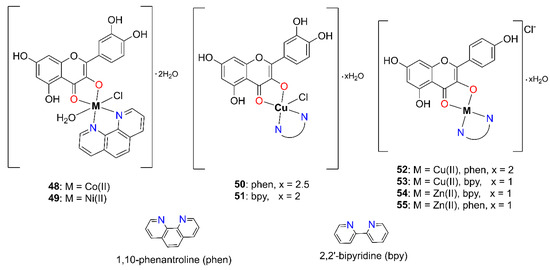 Gençkal et al. synthesized heteroleptic complexes of Co(II), Ni(II), and Cu(II) with quercetin and diimine (phen or bpy) ligands (48–51, Figure 11) [51]. A methanolic solution of metal (II) chloride x-hydrate was added dropwise to a methanolic solution of quercetin and sodium hydroxide under constant stirring at room temperature. The reaction mixture was stirred for an additional hour, after which a methanolic solution of phen or bpy was added. The mixture was then refluxed for approximately 4 h. Upon completion, it was allowed to cool to room temperature, and the resulting solid was filtered, washed with methanol, and dried under ambient conditions.