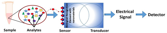 Basic structure of a nanosensor. The analytes from the sample are identified through specific sensors that contain specialized nanoparticles as biological recognition elements. The transducer converts these physicochemical changes to an electrical signal that can be analyzed through detectors.