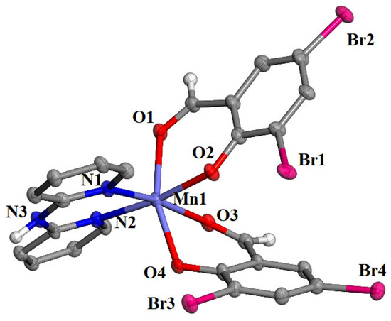 Among complexes 1–5, single-crystals were obtained only for [Mn(3,5-diBr-salo)2(bipyam)] (complex 2) in order to determine its molecular structure with single-crystal X-ray crystallography. Complex 2 crystallized in the monoclinic crystal system and the Cc space group (Table S1). The molecular structure is depicted in Figure 2, and selected bond lengths and angles are summarized in Table 1.