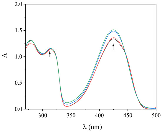 UV–vis spectroscopy titration studies provide initial information regarding the interaction of complexes with CT DNA and aid the determination of the DNA-binding constant (Kb). The UV–vis spectra of the complexes were recorded in the presence of increasing amounts of CT DNA solution (Figure 3 and Figure S4). The intraligand bands in the region 300–315 nm and at 425 nm presented upon addition of CT DNA a slight hyperchromism, while the positions of the corresponding λmax remained stable (Table 2). Such changes reveal the interaction of the compounds with CT DNA [44] but cannot lead to a safe conclusion regarding the mode of this interaction, thus necessitating the employment of more techniques such as DNA-viscosity measurements and EB-displacement studies.