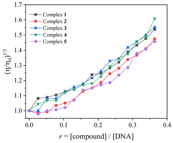 In the current study, the changes in viscosity of a CT DNA solution (0.1 mM) were monitored in the presence of increasing amounts of complexes 1–5 (up to the value of r = 0.36, Figure 4). Especially in the case of complexes 2 and 5, the addition of the complexes initially resulted (up to r~0.1, Figure 4) in a slight decrease in relative DNA viscosity, showing that an external interaction with DNA may probably take place, allowing the complexes to approach DNA. Further addition of the complexes into the DNA solution resulted in a gradual increase in the relative DNA viscosity, revealing an intercalative interaction [47].
