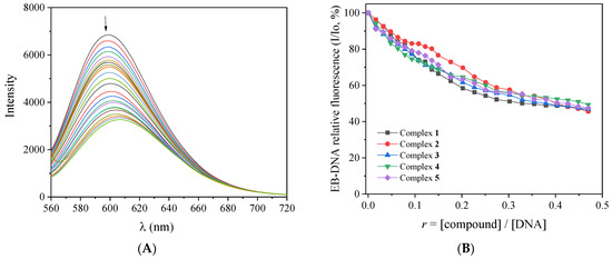 EB intercalates to DNA through its planar phenanthridine ring, which inserts in-between two adjacent DNA bases, resulting in an intense fluorescence emission band at λmax = 592–594 nm upon excitation at 540 nm [48]. It is considered a DNA-intercalation marker, since the quenching of this band in the presence of intercalating compounds is an indication of competition for the same DNA-intercalation sites [48]. For this experiment, the fluorescence emission spectra of a buffer solution containing pretreated EB (40 μM) and CT DNA (40 μM) were recorded (with λexcitation = 540 nm) in the presence of increasing amounts of complexes 1–5 (Figure 5A and Figure S6). The quenching of the EB–DNA emission band at λmax = 594 nm observed for all complexes (up to 54% of the initial fluorescence, Figure 5B, Table 3) may be assigned to the displacement of the EB from EB-DNA induced by the complexes as a result of the competition for the same DNA sites. Such displacement of EB indirectly suggests intercalation as the most probable mode of interaction between CT DNA and complexes 1–5 [48].