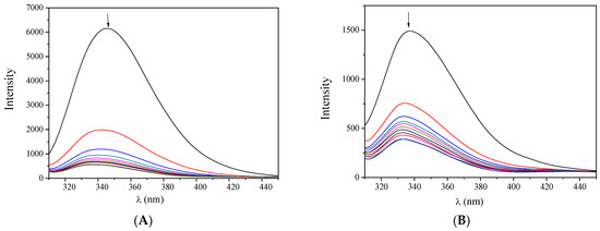 Fluorescence emission spectra (λexcitation = 295 nm) of (A) BSA (3 μM) and (B) HSA (3 μM) in buffer solution (150 mM NaCl and 15 mM trisodium citrate at pH 7.0) in the presence of increasing amounts of complex 1. The arrows show the changes in intensity upon increasing amounts of the complex.