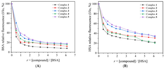 The fluorescence emission spectra (excitation at 295 nm) of the albumins (3 μM) in buffer solution were recorded in the presence of increasing amounts of complexes 1–5 (Figure 6, Figures S8 and S9). The intense fluorescence emission band observed at 345 nm (for BSA) or 340 nm (for HSA) exhibited a significant quenching (up to 92% of the initial emission intensity) in the presence of the complexes (Figure 7). Such quenching may result from the changes in the albumin’s secondary structure and may be attributed to possible alterations of tryptophan residues of Sas and serves as an indication of the interaction of the complexes with the albumins [48].