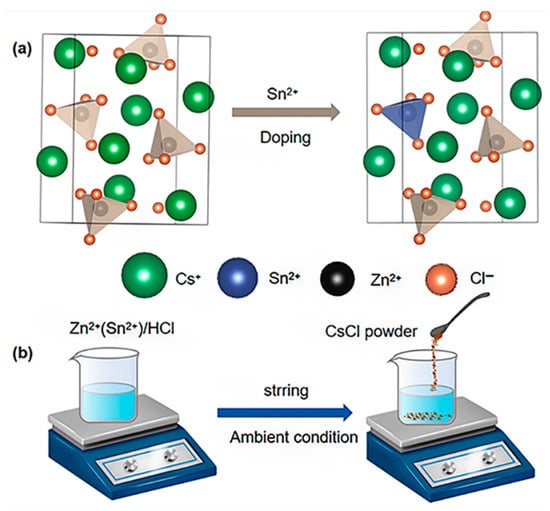 (a) The crystal structure diagrams of Cs2ZnCl4 and Sn(II)-doped Cs2ZnCl4; (b) A schematic diagram of the synthesis process of the pristine and Sn(II)-doped Cs2ZnCl4 crystals.
