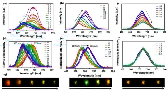 The pressure-dependent PL spectra of Sn(II)-doped Cs2ZnCl4 crystals were measured using in situ PL spectroscopy during both compression and decompression processes. The Sn(II)-doped Cs2ZnCl4 crystals exhibit broad emission, associated with the inorganic lattice’s local distortion, which was detected at ambient conditions in Figure 2a. The single PL peak centered at ca. 678.0 nm, with a full width at half-maximum (FWHM) of ca.120.0 nm, was observed at ambient conditions. This PL peak could be attributed to the STE emission of the disphenoidal [SnCl4]2− units in the host matrix. For certain ions with ns2 outer electronic configuration (Sn2+ with 5s2), the singlet electronic ground state was denoted as 1S0 and the nsnp excited state was split into singlet 1P and triplet 3P states [12]. The triplet 3P state further splits into three non-degenerate states denoted as 3Pn (n = 0, 1, 2) [32]. The transition rule indicates that the 1P1 to 1S0 transition is allowed and the 3P1 to 1S0 transition is partially allowed due to the spin–orbit coupling of heavy atoms. However, 3P2 to 1S0 and 3P0 to 1S0 are forbidden transitions. Under UV radiation, the emission of Sn(II)-doped Cs2ZnCl4 is centered at approximately 678 nm, which is consistent with the previously reported results [11]. With the increase in pressure, the STE emission experienced an unambiguous pressure-sensitive evolution. The PL intensity decreases significantly, and the PL peak blue-shifts from 678 nm to 560 nm at 1.9 GPa (Figure 2a–c). The increase in PL intensity observed at 5.7 GPa is attributed to an increase in the concentration of self-trapped excitons (STEs), resulting from lattice compression. When the pressure was increased to 8.0 GPa, the PL intensity continued to rise, accompanied by a red shift from 560 nm to 635 nm, originating from a pressure-induced isostructural phase transition occurring at approximately 8.0 GPa. When the pressure reaches 11.5 GPa, the original emission at λ = 678 nm gradually disappears. After that, the PL intensity decreases again, while the peak position remains almost unchanged. As shown in Figure 2d,e, the normalized spectra revealed the shift in peak positions during the pressure variation process. When the pressure was increased to 22.6 GPa (Figure 2f), the PL peak position remains virtually unchanged, accompanied by a gradual decrease in fluorescence intensity. In addition, the fluorescent micrographs of Sn(II)-doped Cs2ZnCl4 clearly demonstrated the PL brightness changes with increasing pressure. Upon completely releasing pressure to the ambient conditions, a pressure-driven PL peak reversibility of Sn(II)-doped Cs2ZnCl4 was identified (Figure S2). While the PL intensity shows a slightly smaller value than the initial state, which should be related to the incomplete recrystallization process.