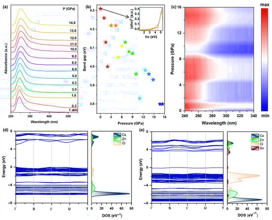 (a) UV-vis absorption spectroscopy of Sn(II)-doped Cs2ZnCl4 under high pressure; (b) Band gap evolution of Sn(II)-doped Cs2ZnCl4 upon compression; (c) Absorption heatmap of Sn(II)-doped Cs2ZnCl4 upon compression; (d) DFT-calculated band structure and projected density of states of Cs2ZnCl4 and (e) Sn(II)-doped Cs2ZnCl4 under ambient conditions.