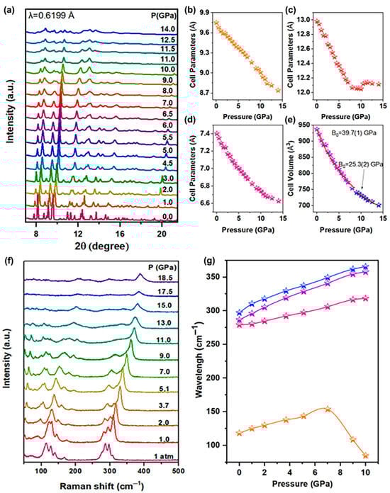 Pressure, as a fundamental thermodynamic variable independent of temperature and chemical composition, enables precise modulation of interatomic distances without altering stoichiometry. This unique capability directly perturbs intermolecular interactions and modifies intrinsic atomic-scale properties through controlled lattice compression. As we all know, the crystal structure has a close correlation with the optical properties of all-inorganic lead-free halide perovskites [21,22]. The adjustable structure of perovskite can easily respond to most external pressure stimuli [4,23]. Thus, high-pressure techniques serve as a powerful strategy for probing the intrinsic structure–property correlations in functional materials, refs. [24,25,26], enabling non-destructive modulation of lattice parameters while preserving chemical composition [27,28,29,30,31]. Consequently, high-pressure methodology serves as a critical experimental paradigm for probing structure–optoelectronic property correlations in perovskite materials through controlled lattice compression without altering stoichiometry.