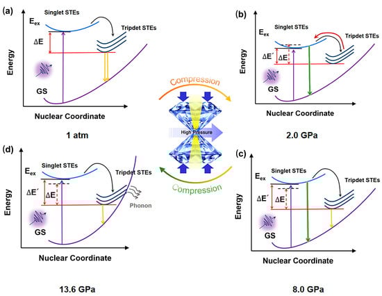 The mechanism of piezochromism for Sn(II)-doped Cs2ZnCl4 was illustrated in Figure 5. Under ambient conditions, a broad PL spectrum was observed in the measurement, which also exists widely in multiple different STE emission systems. The broad STE emission of Sn(II)-doped Cs2ZnCl4 originated from the electron and hole being bound to form an exciton trapped in the distorted disphenoidal [SnCl4]2− units. [SnCl4]2− will act as the radiative recombination center for STE emission, and STE emission can be regarded as the 3P1 → 1S0 transition of Sn2+ from excited to ground states. A pressure-driven reverse intersystem crossing (RISC) from triplet excited states back to singlet states was established principally by the difference (∆E) between the two states. With increasing pressure up to 2.0 GPa, the adjacent [SnCl4]2− moved closer, and Sn(II)-doped Cs2ZnCl4 was compressed under pressure, resulting in a gradual decrease in ∆E. Therefore, more excitons were trapped in high-energy excited singlet states, which is consistent with the change in PL peak blue-shift from 678 nm to 560 nm. As the pressure further increased and exceeded 5.7 GPa, the STEs exhibited an obvious increase, which is attributed to an increase in the concentration of self-trapped excitons (STEs), resulting from lattice compression. When the pressure reaches 8.0 GPa, an abrupt change in the pressure response of the b-axis lattice parameter of Sn(II)-doped Cs2ZnCl4 crystals occurs. The PL intensity continues to rise, accompanied by a red shift from 560 nm to 635 nm, originating from a pressure-induced isostructural phase transition occurring at approximately 8.0 GPa. Therefore, the band gap increased again, and the emission with two PL peaks centered at ca. 560 nm and 678 nm, respectively. As pressure further increased and exceeded 13.6 GPa, due to the further compressed structure, the highly structural distortion and the strong electron–phonon coupling led to a high crossover between STE states and the ground state, making the trapped excitons easily annihilated through the phonon-assisted pathway. Thus, facilitating the formation of bound excitons to dominate the decrease in PL intensity.