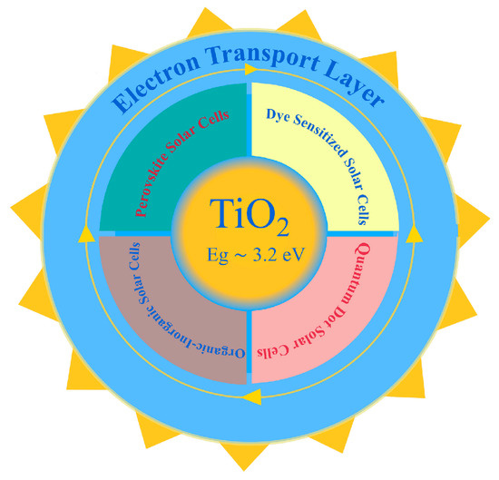 Due to the enormous energy consumption and the negative impact of non-renewable sources on the environment, the demand for renewable energy sources continues to grow. Over the last few decades, there has been notable interest in research and development in the field of photovoltaics, i.e., solar cells [1,2,3]. Numerous theoretical and experimental studies eventually led to the development of three generations of solar cells [3,4,5]. Third-generation solar cells are recognized as promising technologies with rising power conversion efficiency [2,3,4,5], characterized by simple and low-cost fabrication processes. These devices can be manufactured with minimal use of hazardous materials, which makes them ecologically acceptable and sustainable, in line with the most important objectives of today’s society. Titanium dioxide (TiO2) is a widely spread semiconducting material that has the role of the electron transport layer in third-generation solar cells (Figure 1), like dye-sensitized solar cells (DSSCs) [6,7,8,9], quantum-dot-sensitized solar cells (QDSSCs) [10,11,12], hybrid organic-inorganic solar cells [13,14,15], and perovskite solar cells (PSC) [16,17,18,19].