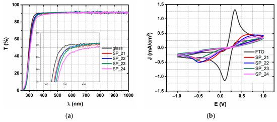 Transmittance spectra (a) and cyclic voltammograms (b) of the second series of samples, SP_21-SP_24, prepared by diode sputtering.