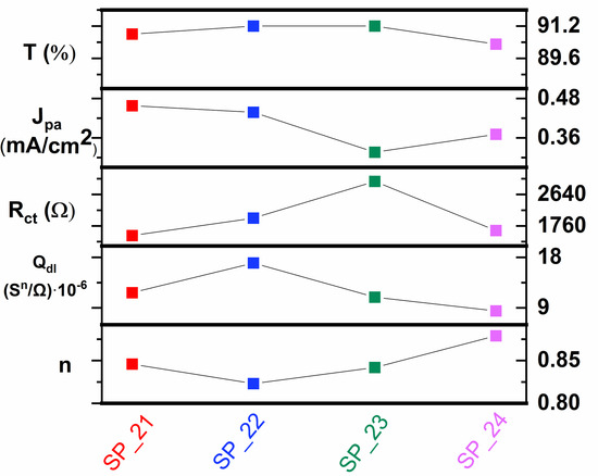To achieve more transparent blocking layers and consequently photoanodes, sputtering powers and deposition times were reduced in the second series, SP_21-24. Transmittance spectra of the second sputtered series SP_21-24 are presented in Figure 2, while transmittance values are presented in Figure 3 and Table S1. Estimated optical absorption edges (nm) are presented in Table S2. Along with the transmittance values of sputtered samples, electrochemical parameters (Jpa, Rct, Qdl, and n) are also represented in Figure 3 and will be described later on. As observed in Figure 2 and Figure 3, for the deposition time of 5 min, the sputtering power has minimal influence on the film transparency, as evidenced by the similar transmittance values of samples SP_21-23 (which were sputtered with powers of 200 W, 250 W, and 300 W for 5 min). The UV-VIS spectrum of the sample SP_24 (sputtered for 10 min with a sputtering power of 200 W) differs from the first three samples. The absorption edge of SP_24 is slightly shifted to longer wavelengths of the UV-VIS spectrum (306 nm) in comparison to the other samples, but in general, the values are very similar (Table S2).