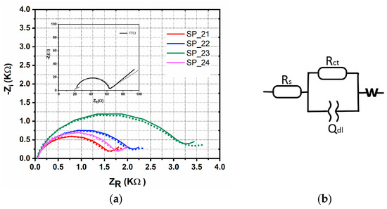 Nyquist’s plots of sputtered samples (SP_21-24) and bare FTO (a), with the equivalent circuit used for fitting EIS data (b).