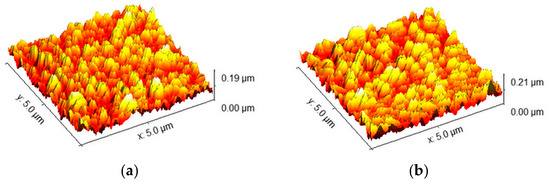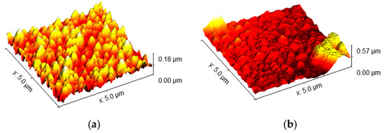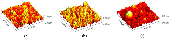 In order to better understand the morphology and growth of TiO2 in the sputtered samples, the bare FTO and the sample SP_21, deposited over the shortest period of time, using the lowest power (200 W, 5 min), were analyzed by atomic force microscopy. The obtained results are presented in Figure 7. It can be seen that the surface of bare FTO has sharp spikes, while the surface of the thinnest sputtered sample, SP_21, shows a slight change in roughness, with more rounded spikes, and more uniform morphology. Therefore, it can be concluded that TiO2 deposited via the sputtering method follows the morphology of the surface of the FTO.