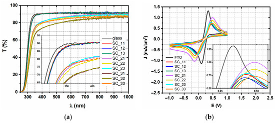 Transmittance spectra of spin-coated samples SC_11-33 (a); cyclic voltammograms of the spin-coated samples SC_11-33 without SC_31 and SC_32, with the inset of anodic part of CV (b).