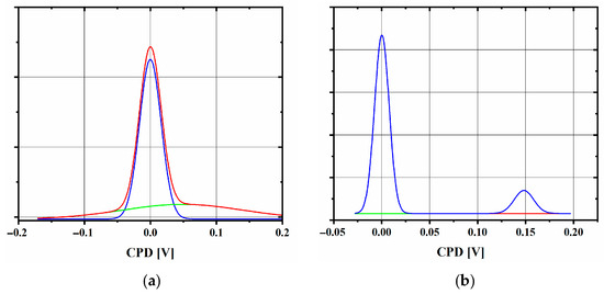 The CPD histogram distributions obtained with KPFM for the samples SC_11 (a) and SC_33 (b). The red line represents measured data, while the green and blue lines represent Gaussian fits of the CPD histograms.