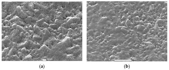 The surfaces of the samples presented in the SEM micrographs in Figure 11 appear different compared to the samples that are made with sputtering (Figure 5). The TiO2 layer of sample SC_11 is characterized by a grainy texture without an ordered compact structure. The surface of sample SC_21 shows similar features, already at a smaller SEM magnification (right side of the image presented in Figure 11b).
