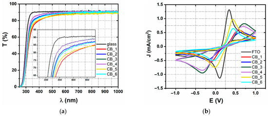 Transmittance spectra (a) and cyclic voltammograms (b) of the chemical bath-deposited samples CB_1-6.