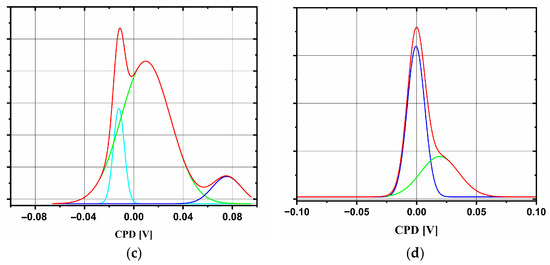 The CPD histogram distributions obtained with KPFM for CB_1 (a), CB_2 (b), CB_3 (c), and CB_6 (d). The red line represents measured data, while the green, blue, and turquoise lines represent Gaussian fits of the CPD histograms.