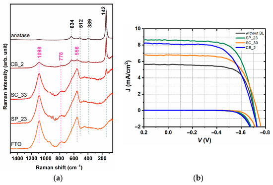 Raman spectra of the best-performing blocking layers on the FTO substrate (a); J-V curves of fabricated DSSCs with those blocking layers (b).