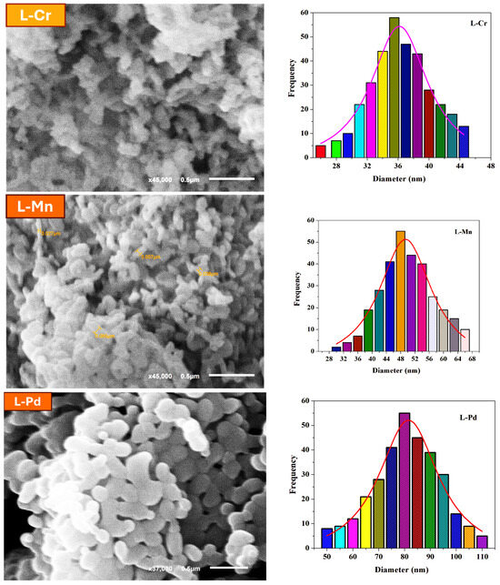 The particle size of the metal complexes, estimated using ImageJ software 12 from the SEM micrographs, ranged between 25 and 45 nm with average of 36 nm for the L-Cr complex, 30–67 with average of 49 nm for the L-Mn complex and 50 and 110 nm with average 81 nm for the L-Pd complex confirming the nanoscale dimensions. The differences in morphology and size among the complexes highlight the impact of metal coordination chemistry on the self-assembly of nanosized structures. The results also indicate that the sono-chemical approach facilitated the formation of well-defined nanosized complexes with enhanced surface properties.