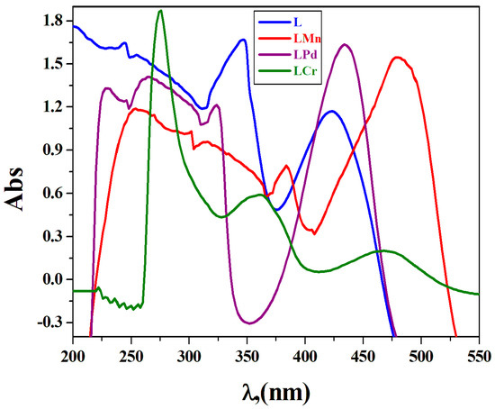 The detailed spectroscopic study of the L ligand, along with its complexes with Cr(III), Mn(II), and Pd(II), was thoroughly recorded at a consistent concentration of 1 × 10−3 mol. dm−3 in DMF, as depicted in Figure 2 and outlined in Table S1. The ligand exhibited absorption maxima at 243 nm (εmax = 1846 dm3 mol−1 mm−1), 256 nm (εmax = 1771 dm3 mol−1 mm−1), and 346 nm (εmax = 1836 dm3 mol−1 mm−1), which can be ascribed to the electronic transitions occurring between π–π* within the aromatic systems and n-π* within the heteroatom-containing aromatic structures. The absorption feature at 421 nm (εmax = 1372 dm3 mol−1 mm−1) is indicative of an intra-ligand transition [26]. Upon complexation, new absorption bands appeared in the range of 331–325 nm, which can be attributed to π–π* transitions of the aromatic system and n–π* transitions associated with the C=N (azomethine), –CH=N–, and phenolic OH groups [27,28]. The spectral data suggests that the ligands are interacting with the respective metal ions, as evidenced by the observed shifts in band positions. The new absorption bands that appeared at 435 nm (εmax = 1936 dm3 mol−1 mm−1) in the L-Pd and 383 nm (εmax = 1182 dm3 mol−1 mm−1) in the L-Mn complexes are indicative of ligand-to-metal charge transfer (LMCT) transitions. These transitions likely originate from the p-orbitals of the ligands and are destined for the d-orbitals of the metal ions. Furthermore, the L-Cr and L-Mn complexes revealed an additional low-intensity broad peak at 475 nm (εmax = 197 dm3 mol−1 mm−1) and 479 nm (εmax = 1953 dm3 mol−1 mm−1), respectively, which was absent in the spectrum of the un-complexed ligand. This feature can be predominantly attributed to the d-d transitions within the metal chelates’ structural frameworks, which are characteristic of the metal–ligand complexation process [29].