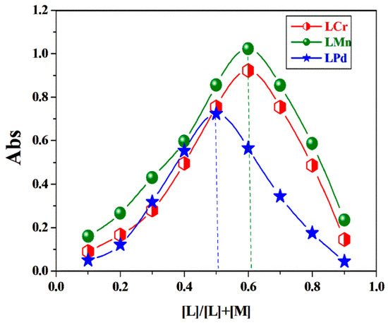 Employing the techniques of continuous variation and molar ratio analysis, the stoichiometry of the synthesized complexes was ascertained [34,35,36,37]. The continuous variation graph revealed an absorbance peak at a ligand mole fraction range of 0.51–0.62, indicating the formation of complexes where Cr(III) and Mn(II) ions bind to the ligand in a 1:2 molar ratio and Pd(II) ion in a 1:1 molar ratio (Figure 3). This observation was corroborated by the molar ratio plot, which also affirmed these specific stoichiometric relationships between the metal ions and the ligand (Figure S5).