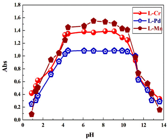 The analysis of complex stability in relation to pH was conducted through spectrophotometry, which entailed measuring the absorbance of the complexes across an extensive pH spectrum from 2 to 12. The characteristic absorption bands corresponding to the metal–ligand charge transfer (LMCT) in the L-Pd complex and d-d transition in the L-Mn and L-Cr complexes were used to assess the pH dependence. This research aimed to establish the exact pH intervals wherein the complexes maintain their structural integrity, thereby ascertaining their operational effectiveness across a variety of environmental pH conditions, which is essential for their intended functionality. The stability curve presented in Figure 4 reveals that these complexes demonstrate persistent steadiness within a pH window of 4 to 11. Given this stability profile, it is anticipated that the complexes will function effectively in surroundings where the pH is contained within these bounds [38].