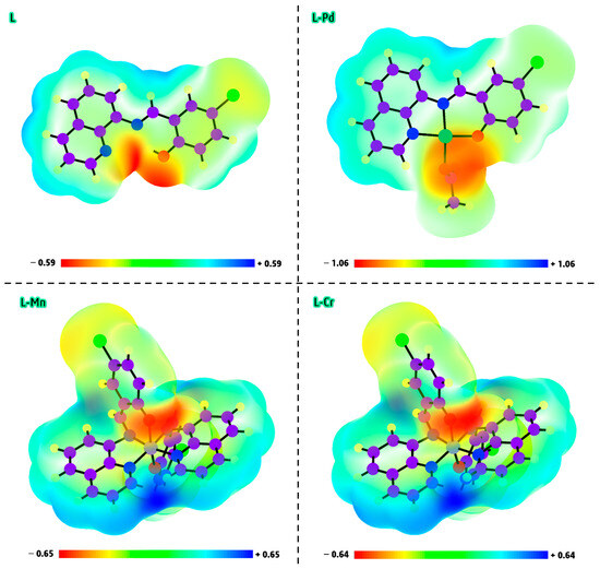The MEP demonstration of L, L-Pd, L-Mn, and L-Cr compounds by computational approach.