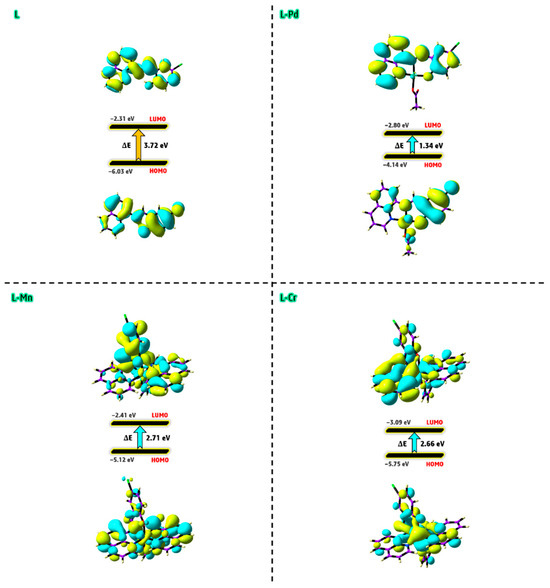 The HOMO and LUMO are key frontier orbitals that define a molecule’s electronic properties and reactivity. These orbitals, representing the outermost boundaries of a molecule’s electronic structure, play a fundamental role in various chemical reactions, particularly those involving electron transfer. HOMO is critical in electron-donating and nucleophilic reactions, as molecules with an intermediate HOMO energy serve as effective electron donors, readily participating in nucleophilic or oxidative processes. Conversely, LUMO represents the lowest accessible energy level for incoming electrons (Figure 7). Molecules with a low LUMO energy are excellent electron acceptors, making them highly reactive in electrophilic interactions. A crucial factor in molecular chemistry is the HOMO–LUMO energy gap. A smaller gap indicates higher reactivity, as the molecule requires less energy for excitation, enhancing its ability to engage in chemical transformations. The calculated energy values for L, L-Pd, L-Mn, and L-Cr are 3.72, 1.34, 2.71, and 2.66 eV, respectively. These findings suggest that the L-Pd complex exhibits the highest biological activity and chemical reactivity among the studied compounds. The observed trend in biological activity and reactivity follows the order of L-Pd > L-Cr > L-Mn > L, while the stability trend is reversed, following the sequence of L > L-Mn > L-Cr > L-Pd. Furthermore, the smaller energy gap of the Pd(II) complex enhances the efficiency of intramolecular charge transfer (ICT) along conjugated pathways. This facilitates electron transfer from electron-donating groups to electron-accepting groups within the molecule [46], thereby improving its electronic properties and reactivity. On the other hand, a smaller HOMO–LUMO gap typically indicates that the complex requires less energy for electronic transitions, thereby facilitating redox processes. The L-Pd complex, with its reduced HOMO–LUMO gap, is likely to possess a higher redox potential, making it more susceptible to electron exchange. This energy gap suggests that the L-Pd complex could exhibit enhanced redox activity, which may have important implications for its catalytic, electrochemical, or biological properties.