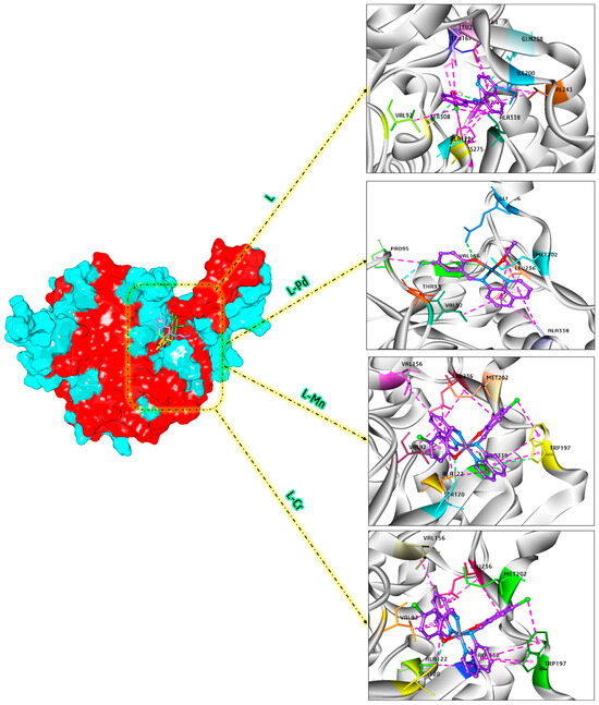 Docking analysis of L, L-Pd, L-Mn, and L-Cr in the interaction with the 5V5Z target.