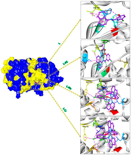 Docking analysis of L, L-Pd, L-Mn, and L-Cr in the interaction with the 3HB5 target.