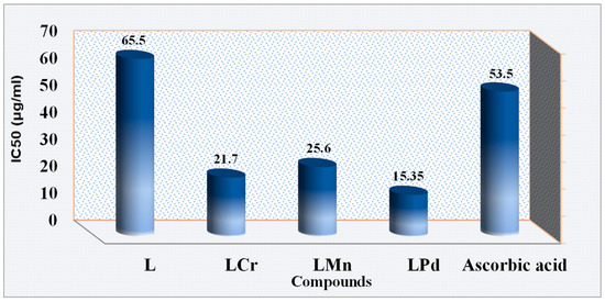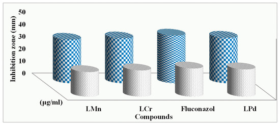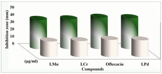 The outcomes from the serial dilution assay (MIC) exhibit a strong congruence with the results obtained via the disk diffusion method, as depicted in Table 5 and Figure 11 and Figure 12. In contrast to other complexes examined, the L-Pd complex has demonstrated remarkable bio-efficiency, with MIC values of 2.25, 3.00, and 1.75 M against S. marcescens, E. coli, and M. luteus, respectively. Amongst the bacterial species under study, M. luteus emerged as the most susceptible, while E. coli displayed the highest resilience. Notably, G. candidum was identified as the most sensitive fungus. This enhancement in antimicrobial potency can be rationalized in light of Overtone’s principles [54,55,56], which suggest that chelation enhances the ligand’s function as a more potent antibacterial agent by constraining bacterial proliferation. The significant increase in the inhibitory zones of metal chelates versus free ligands is indicative of the metal’s ability to interact more effectively with biological targets due to the reduced polarity resulting from the shared positive charge with the ligand’s hetero atoms and the delocalization of π electrons throughout the chelate framework. The bacterial cell wall and membrane, rich in lipids and polysaccharides, provide an optimal environment for metal ion interaction. The varying sensitivity of different bacteria to these complexes may be attributed to differences in their ribosomal structure or cellular permeability. Moreover, the metal complexes’ effectiveness could be influenced by factors such as solubility, size, dipole moment, metal ion redox potential, bond length, complex geometry, and hydrophobicity. The steric hindrance may also affect their antimicrobial activity since limited lipid solubility can impede the metal ion’s ability to reach the cell wall’s active site, thereby hindering the complexes’ antibacterial efficacy. The data suggest that the antibacterial performance of metal complexes is not solely determined by chelation but is instead a multifaceted phenomenon influenced by a confluence of factors. These include the complex’s solubility, the metal–ligand bond length, the metal ion’s redox state, its spatial arrangement within the complex, the molecule’s overall shape, and the physicochemical properties that govern its interaction with bacterial membranes and subsequent cell penetration. Additionally, pharmacokinetic factors such as concentration and the molecule’s tendency to partition between hydrophilic and hydrophobic environments contribute to the overall antimicrobial efficacy. Thus, the observed increase in antibacterial activity of metal complexes can be ascribed to a composite of various mechanisms beyond chelation, which may interact synergistically to inhibit microbial growth [57,58].