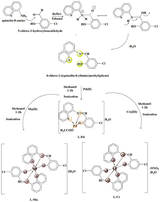 Pharmaceutical innovation frequently involves a chemical strategy that combines several molecules to produce new ones with unprecedented biological properties. The synthesis of compounds, particularly the versatile class of Schiff bases, is notable for their anticancer, antibacterial, and anti-inflammatory characteristics, as well as various catalytic, optical, and sensing properties [1,2,3,4]. These molecules readily interact with almost every metal ion, which is why they are pivotal components in the realm of coordination chemistry. The objective of creating metal complexes is to tailor their physicochemical properties due to the broad spectrum of coordination environments, oxidation states, redox potentials, and ligand arrangements. Consequently, the biological actions of diverse ligands are significantly influenced when they form complexes [5,6,7]. The domain of metal-complex-based anticancer therapy is in a constant state of advancement, with scientists investigating innovative metal complexes, combination treatments, targeted delivery mechanisms, and tactics to surmount resistance [8,9,10]. Personalized medical approaches, which consider the individual genetic profiles of patients and their tumor cells, show substantial promise for enhancing the effectiveness of these therapies and reducing side effects. This category of metal-based treatments represents a vast and promising avenue for cancer care, potentially leading to superior outcomes. Furthermore, antimicrobial metal complexes boast a multitude of potential uses across different sectors, including medical applications such as antimicrobial medications and wound coverings, agricultural purposes like pesticides and fungicides, and consumer goods like antimicrobial coatings for various surfaces. A significant hurdle in the development of these complexes lies in achieving selective toxicity towards pathogenic microbes while minimizing harm to human cells. The design focus is on complexes that can target microbial cells with precision, thereby reducing the impact on the host organism. This selectivity is essential for their successful application across various fields. The design and synthesis of transition metal complexes with Schiff base ligands have attracted significant interest due to their diverse structural features, chemical versatility, and broad spectrum of biological applications, including antimicrobial, anticancer, and antioxidant activities [11,12]. Schiff bases, derived from the condensation of primary amines with carbonyl compounds, possess azomethine (-C=N-) functional groups, which facilitate strong coordination with metal ions, thereby enhancing their stability and biological properties [13]. Among the various Schiff base ligands, those incorporating quinoline moieties have demonstrated remarkable pharmacological potential due to their π-conjugated system, which enhances electronic interactions and biological activity [14]. The incorporation of metal ions such as chromium Cr(III), manganese Mn(II), and palladium Pd (II) into these ligands is particularly interesting, as these metals exhibit diverse coordination geometries and oxidation states, influencing the electronic and biological behavior of the resulting complexes [15,16]. Ultrasound-assisted (sono-chemical) synthesis has emerged as a promising technique in the preparation of nanostructured metal complexes, offering advantages such as improved reaction rates, reduced particle size, and enhanced purity compared to conventional synthetic routes [17]. Sono-chemical methods induce cavitation effects, leading to localized high temperatures and pressures, which significantly impact nucleation and growth kinetics, favoring the formation of nanosized materials with improved physicochemical properties [18].