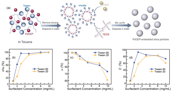 (a) Schematic diagram showing the preparation process for silica particles. (b,c) Plots of (b) solubilization capacity (c/c0) of PdOEP by Tween 80/Tween 20 micelles and (c) embedding efficiency (ω) against surfactant concentration. (d) Plots of embedding capacity (C) of silica particles prepared with Tween 80 and Tween 20 for PdOEP against surfactant concentration.