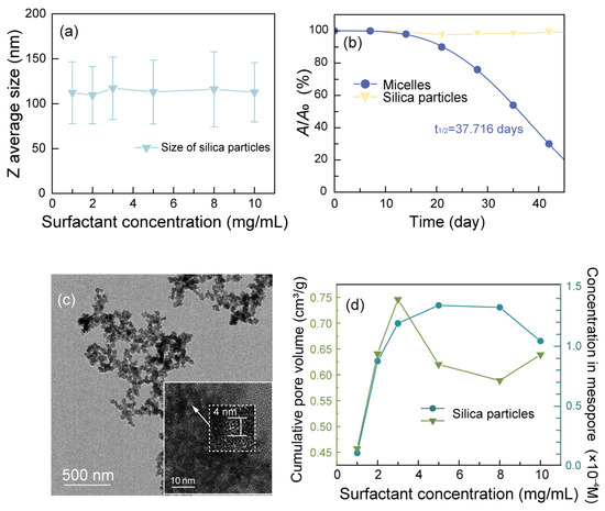UV–visible absorption spectra and fluorescence emission spectra were recorded at room temperature using UV-1900 and RF-6000 spectrophotometers (Shimadzu Corporation, Kyoto, Japan), respectively. The particle size of micelles and particles was measured via dynamic light scattering (DLS) using a Zetasizer Nano ZS 90 (Malvern Instruments Ltd., Malvern, UK). The DLS data are detailed in Figure S3. The silica particle samples were calcined in a muffle furnace at 300 °C and 600 °C for six hours each and degassed at 250 °C for six hours [48]. Nitrogen adsorption–desorption isotherms and the pore size distribution of the silica particles were determined using a Micromeritics ASAP 2010 Accelerated Surface Area and Porosimetry Analyzer (Micromeritics, Norcross, GA, USA). The mesoporous structure and morphological features of the samples were observed via transmission electron microscopy (TEM).