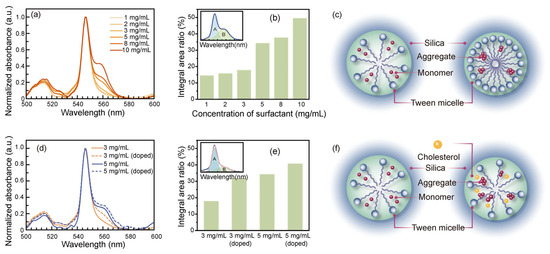 (a) Normalized absorption spectra of PdOEP-embedded silica particles prepared under varying surfactant concentrations. (b) Peak shoulder area ratio vs. surfactant concentration derived from spectral peak fitting. A and B represent the areas of the two peaks obtained from peak-fitting, respectively. (c) Schematic illustration of the effect of micelle structural evolution on PdOEP aggregation in silica particles with increasing surfactant concentration. (d) Normalized absorption spectra of PdOEP-embedded silica particles prepared with (solid line) and without (dashed line) cholesterol at Tween 80 concentrations of 3 and 5 mg/mL. (e) Peak shoulder area ratios of the PdOEP-embedded silica particles prepared with/without cholesterol addition at 3 and 5 mg/mL Tween 80. A and B represent the areas of the two peaks obtained from peak-fitting, respectively. (f) Schematic illustration of the effect of cholesterol on the micellar structures and subsequent PdOEP aggregation.
