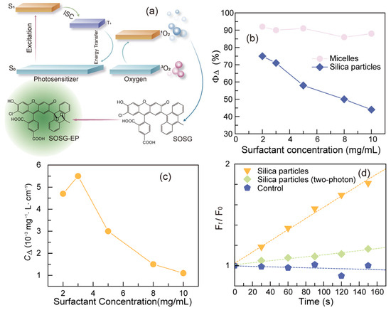 As shown in Figure 4b and Figure S10, PdOEP in micelles maintained a constant ΦΔ of approximately 93% across surfactant concentrations (2–10 mg/mL), consistent with its value in toluene solution [29]. However, for the PdOEP-embedded silica particles, ΦΔ decreased sharply from >70% at 2–3 mg/mL Tween 80 to <60% at >5 mg/mL, exhibiting an inverse correlation with PdOEP aggregation degree (Figure 4b). At the maximum tested Tween 80 concentration (10 mg/mL), ΦΔ decreased further to 44%. These results demonstrate that the ΦΔ values of PdOEP-embedded silica particles were only comparable to those of micelle-dispersed PdOEP at Tween 80 concentrations ≤ 3 mg/mL. Higher concentrations of Tween 80 in the reaction solution caused severe intra-particle aggregation, significantly reducing ΦΔ.
