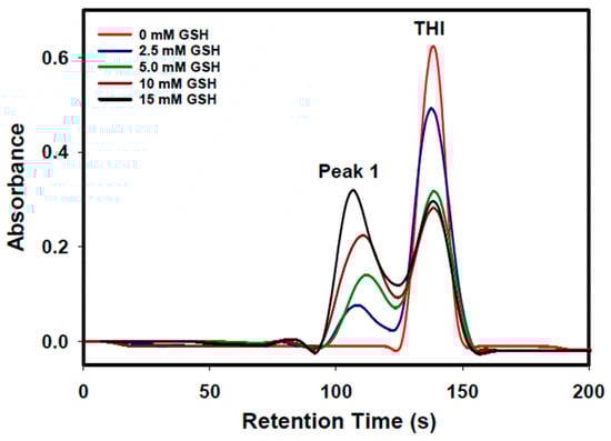 Since THI is widely used in a variety of pharmaceutical products numerous previous studies have investigated its stability in aqueous solutions, such as vaccines to determine its shelf life [,]. While the results from these studies provided insight into the integrity of THI under storage conditions, much less is known about the potential degradation of THI by biomolecules after its intramuscular injection into people. As soon as THI enters cells it will encounter small molecular weight thiols, such as Cys and GSH (Figure 1B,C) which are present at mM concentrations. Indeed, recent studies have allowed to observe the degradation of the organomercurial compound phenylmercuric acetate (PMA) by Cys at physiological pH []. To understand the degradation of another organomercury compound that is of pharmaceutical interest, we have employed a LC-approach which encompassed a Hg-specific detector, namely a flame atomic absorption spectrometer (FAAS) to study the degradation of THI. THI was injected into a C18-HPLC column and eluted using mobile phases that contained different GSH concentrations at physiological pH.