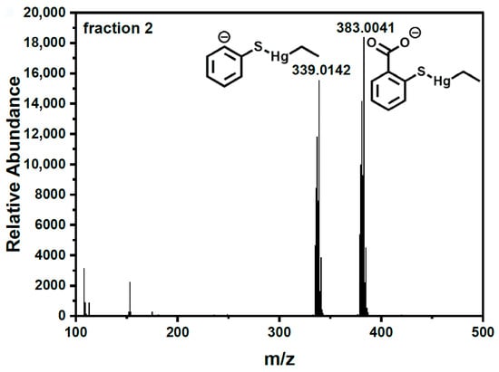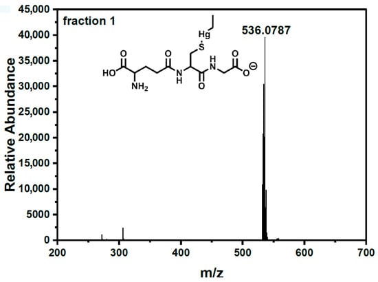 The ESI-MS experiments to identify the Hg-species in the column effluent were conducted using previously established parameters []. To identify the Hg-degradation product that was formed on the column when THI was injected with the 15 mM GSH containing mobile phase, the corresponding Hg-containing fractions were collected and analyzed by LC-ESI MS with an Agilent 1200 series HPLC coupled to an Agilent 6520 Q-TOF mass spectrometer (Agilent, Santa Clara, CA, USA). Separation of the Hg complexes from the buffer matrix was achieved with an Agilent Eclipse Plus C18 column (2.1 mm × 100 mm, 3.5 μm particle size) and a 20 mM NH4HCO3/methanol gradient (0–1 min 20% MeOH, 1–9 min gradient to 90% MeOH, 9–10 min 90% MeOH). Flow rate, injection volume, and column temperature were 0.4 mL/min, 1 μL, and 45 C, respectively. Fraction 1 (~105 s) was analyzed in positive and negative ESI modes, and fraction 2 (~139 s) was analyzed in negative ESI mode only. Extracted ion chromatograms (EIC) of the Hg complexes were obtained from the TIC using the calculated theoretical mass ± 10 ppm.