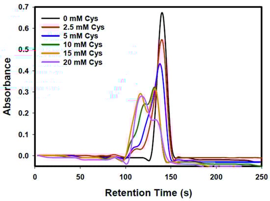 Representative Hg-specific chromatograms obtained for THI as a function of the Cys concentration in the 100 mM phosphate-buffer (pH 7.4):ACN 70:30 (v:v) mobile phase. Stationary phase: Gemini C18-HPLC column (150 × 4.6 mm I.D., 5 μm particles); Flow rate: 1.0 mL/min; Detector: FAAS at 253.7 nm; Injection volume: 50 μL (1000 µg Hg).