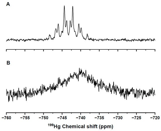 Hg-NMR spectra obtained for 0.2 M THI in 100 mM phosphate buffer (in D2O):ACN 70:30 (v:v) (A) and 0.2 M THI and 30 mM GSH in 100 mM phosphate buffer (in D2O):ACN 70:30 (v:v) (B).