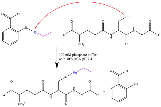 The results that were obtained for the interaction of THI with GSH at physiological pH in the presence of 30% ACN are all congruent with the formation of a GS-EtHg adduct at these conditions (Figure 7). Although our results were not obtained in 100% aqueous solution, previous studies have conclusively demonstrated that THI—after its incubation with RBC cytosol at 37° Celsius—degraded over a 6 h period and progressively co-eluted with hemoglobin (Hb) []. The binding of the EtHg-breakdown product of THI to Hb was confirmed by analyzing a fraction containing the putative EtHg-Hb adduct by X-ray absorption spectroscopy, which revealed a Hg-S bond length that was congruent with literature results []. Based on these previous studies obtained with RBC cytosol it appears that THI degrades within cells and the formed degradation product EtHg will then competitively bind to biological thiols, such as GSH and/or Hb based on steric factors. Future studies should investigate whether the GS-EtHg adduct can bind to cytosolic proteins, such as Hb using established metallomics techniques []. Based on previous results by others another promising future investigation is to evaluate if the GS-EtHg adduct will bind to calcium channels as there appears to be a link between THI and the perturbation of the Ca-metabolism in certain cell types [,].
