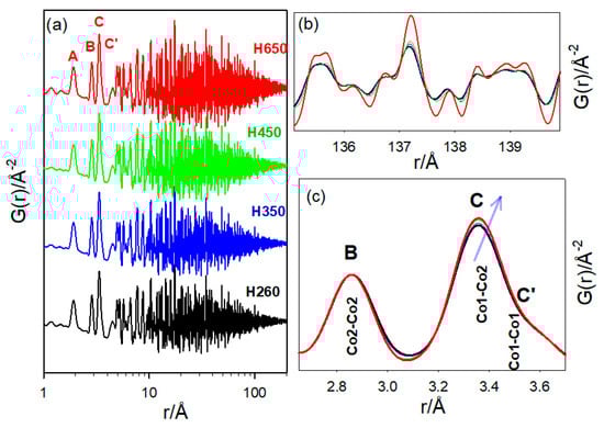 In Figure 4, the shortest interatomic distances of the spinel structure are easily identified: the peak around 1.9 Å, labelled A, encompasses all the nearest Co1/Co2-O distances; the one centred at ≈2.85 Å, labelled B, involves only distances between Co2-Co2 ions at the centre of edge-shearing octahedra. Co1-Co2, Co1-Co1 and Co1-O distances contribute to the following peaks around ≈3.35 Å (labelled C) and to its shoulder at its right side (C’) around 3.55 Å; in Figure 4c, the 2.5 < r < 4.0 interval is shown on an enlarged r scale. G(r) peak amplitudes have been slightly rescaled to equalize the height of the B peak, therefore evidencing the raising of the height of the peak C on increasing Tann.