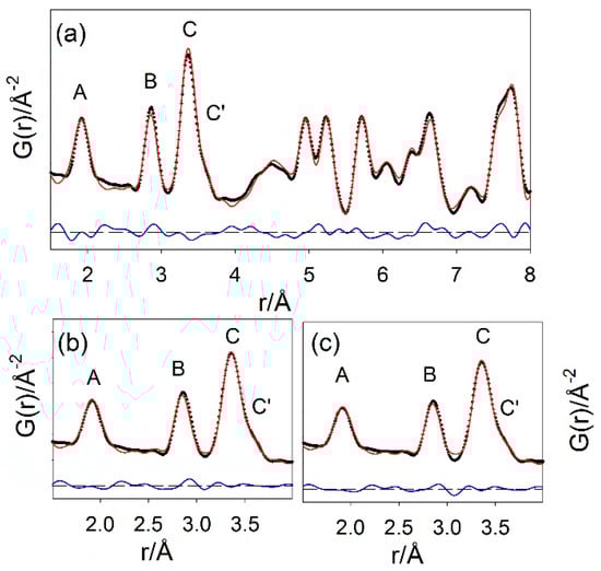 Details of H260 and H650 samples’ G(r) functions. Labels A, B, C and C’ have the same meaning as in Figure 4. Experimental data (black crosses) and fitted curves using the real-space Rietveld analysis and model_2 (red curves) are shown, as well as the residuals (blue curves). (a) H260 fitted in the 1.5–8 Å interval; (b) H260 fitted in the 1.5–4 Å interval; (c) H650 fitted in the 1.5–4 Å interval.