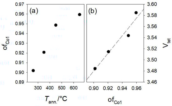 All the trends revealed by neutron diffraction are also confirmed by the PDF analysis at the local scale: a, xO and ofCo1 increase upon raising Tann. OfCo1 obtained by X-ray PDF analysis displayed in Figure 7a are in good accord with the NPD findings (see Figure 3c). Finally, the PDF results also indicate the shrinking of the volume of CoO4 tetrahedron Vtet on depleting ofCo1 (see Figure 7b). More severe effects are revealed by PDF with respect to the reciprocal space NPD analysis, i.e., smaller absolute Vtet values and larger changes upon varying ofCo1. This enforces the idea that Co vacancies heavily affect the structure at the local scale.