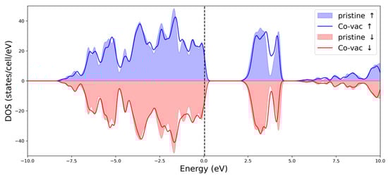 Firstly, DFT calculations were carried out on the ideally defect-free Co3O4 spinel structure. In the Co3O4 spinel structure, the Co2+ ions are coupled anti-ferromagnetically, as described in Ref. []. We found a magnetic moment of 2.41 μB on the Co2+, in good agreement with previous calculations [].