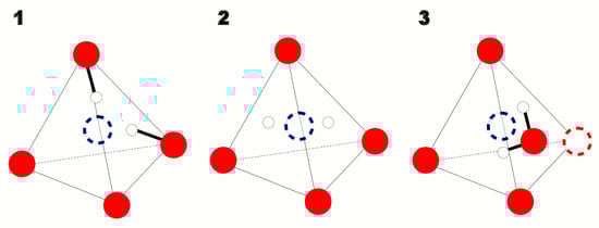 Geometrical relaxations obtained after adding two hydrogen atoms to the Co1 vacancy. Numbers 1, 2 and 3 characterized the three different initial configurations. The red filled circles represent the positions of the oxygen in the tetrahedral site. The white circles are the added hydrogen atoms. The blue dashed circle represents the the Co vacancy. In configuration 3, the red dashed circle represents the original position of the oxygen which has been displaced to form the water molecule.
